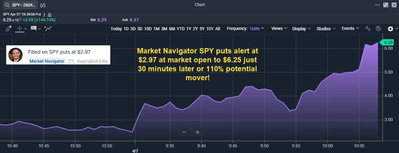 I sent a Market Navigator alert to my members that I was getting filled on SPY puts at $2.97: